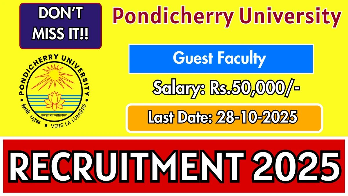 Pondicherry University has released an official notification for the recruitment of 2 Guest Faculty Posts. Interested and eligible candidates can apply Offline through the official Pondicherry University website. The last date to submit the application form is 28-10-2025. In this article, you’ll find the Pondicherry University Guest Faculty Posts recruitment details, including eligibility criteria, age limit, salary structure, selection process, application steps, and direct links to the official notification and Offline application form.