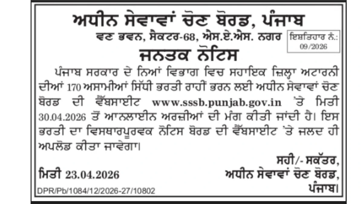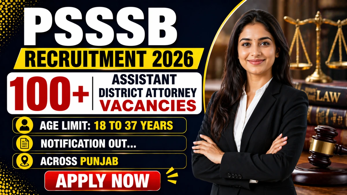 The Punjab Subordinate Services Selection Board (PSSSB) has released a short notice for the recruitment of Assistant District Attorney (ADA) posts under Advertisement No. 09/2026. This recruitment offers an excellent opportunity for law graduates seeking government jobs in Punjab.