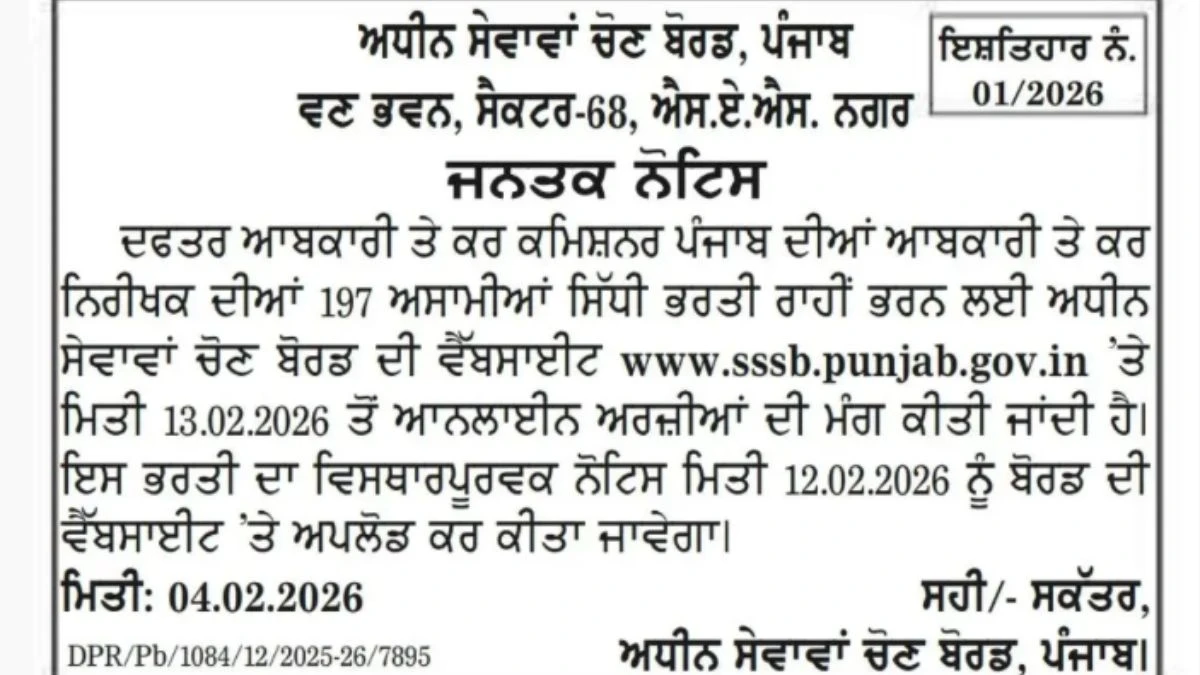 Punjab Subordinate Service Selection Board (PSSSB) has released an official notification for the recruitment of 197 Excise and Taxation Inspector Posts. Interested and eligible candidates can apply Online through the official PSSSB website. In this article, you’ll find the PSSSB Excise and Taxation Inspector Posts recruitment details, including eligibility criteria, age limit, salary structure, selection process, application steps, and direct links to the official notification and Online application form.