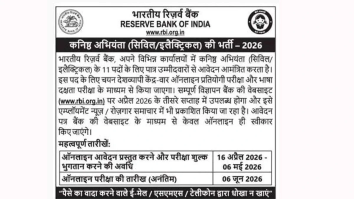 RBI Junior Engineer (Civil/ Electrical) Recruitment 2026 official notification has been released for 11 posts (7 Civil + 4 Electrical) in the Reserve Bank of India. The online application process starts on 16 April 2026, and the last date to apply is 06 May 2026. In this article, you’ll find the RBI Junior Engineer Posts recruitment details, including eligibility criteria, age limit, salary structure, selection process, application steps, and direct links to the official notification and Online application form.