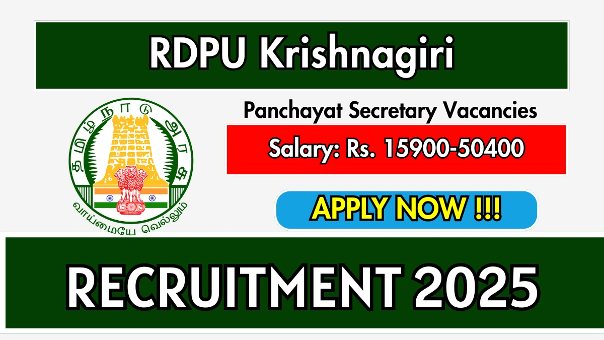 The Rural Development and Panchayat Unit Krishnagiri (RDPU Krishnagiri) Recruitment 2025 for 50 posts of Panchayat Secretary. Candidates with 10TH Can Apply Offline. The Offline application opens on 10-10-2025, and closes on 09-11-2025. The candidate shall apply Offline through RDPU Krishnagiri website, krishnagiri.nic.in.