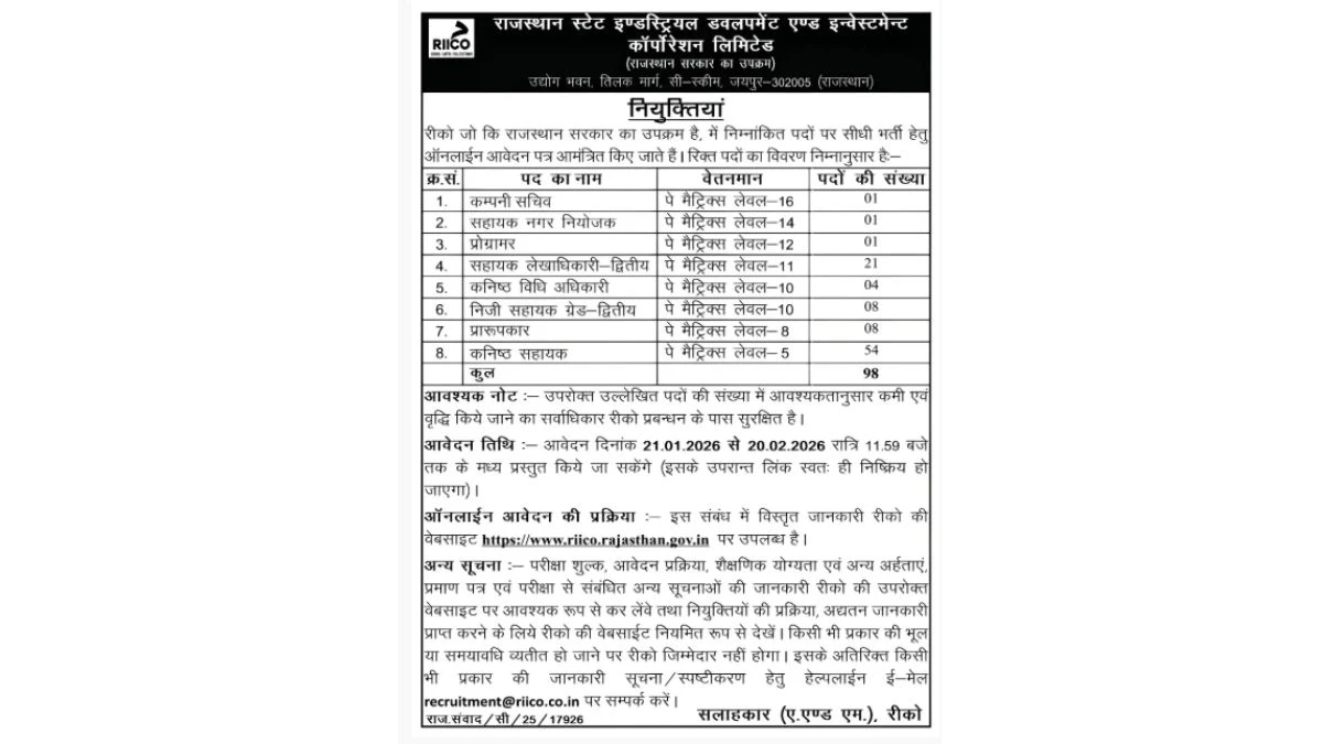 Rajasthan State Industrial Development and Investment Corporation (RIICO) has released an official notification for the recruitment of 98 Junior Assistant, Draughtsman and Other Posts. Interested and eligible candidates can apply Online through the official RIICO website. The last date to submit the application form is 20-02-2026. In this article, you’ll find the RIICO Junior Assistant, Draughtsman and Other Posts recruitment details, including eligibility criteria, age limit, salary structure, selection process, application steps, and direct links to the official notification and Online application form.