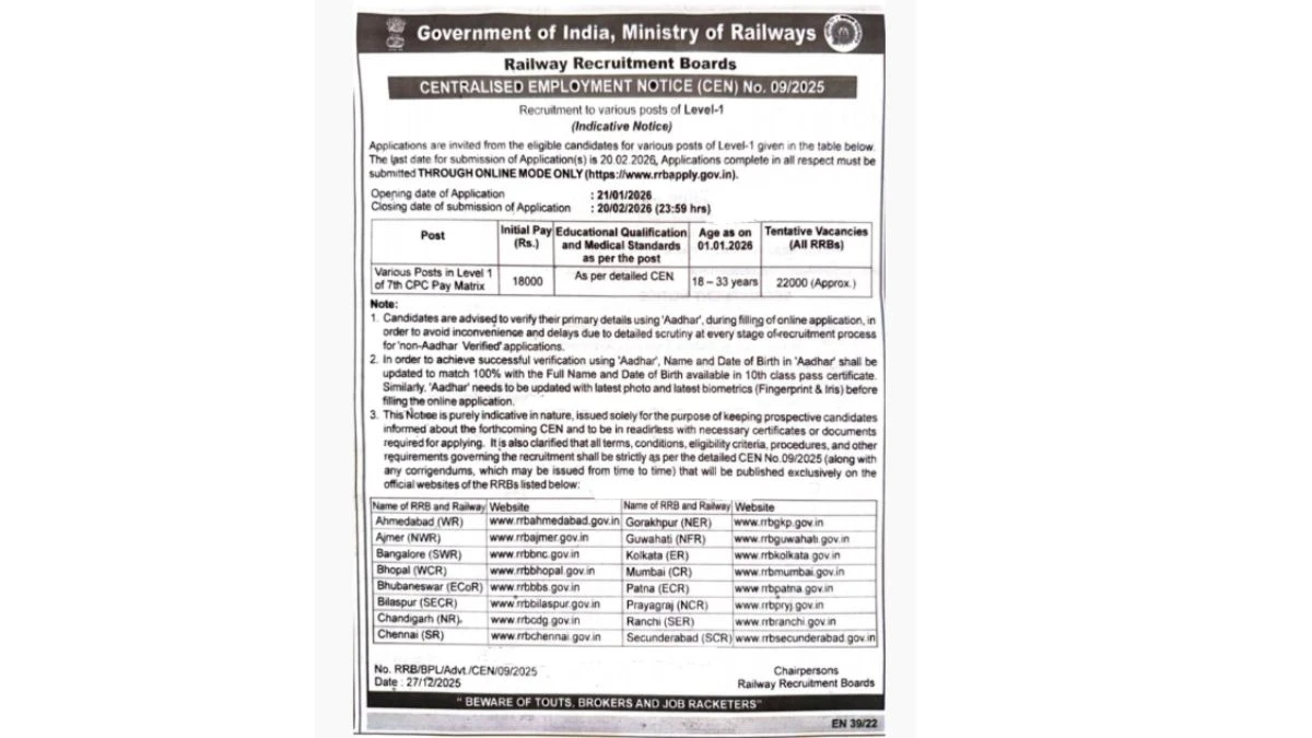 The Railway Recruitment Board (RRB) Recruitment 2026 for 22000 posts of Group D. Candidates with ITI, 10TH Can Apply Online. The online application opens on 20-01-2026, and closes on 20-02-2026. The candidate shall apply online through RRB website, rrbchennai.gov.in.