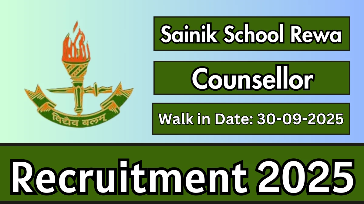 Sainik School Rewa Recruitment 2025 for 01 posts of Counsellor. Candidates with B.Sc, Diploma, M.Sc Can attend the walkin. The Walk-in on 30-09-2025. For detailed information please visit Sainik School Rewa official website, sainikschoolrewa.ac.in.