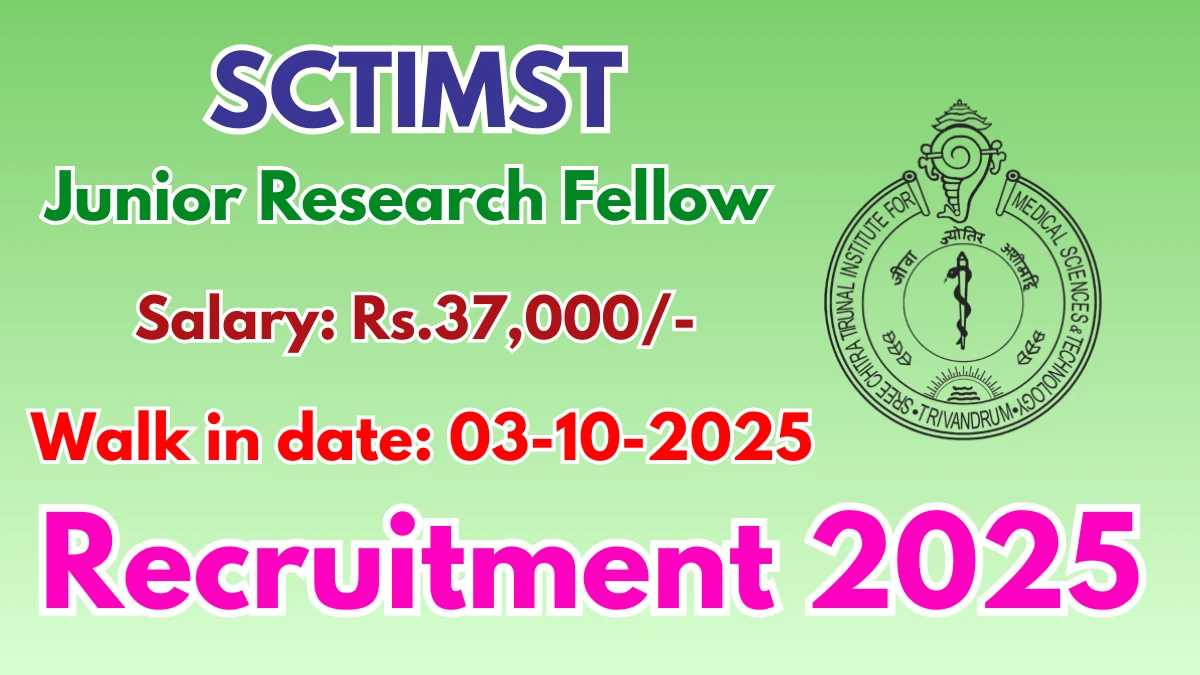 Sree Chitra Tirunal Institute for Medical Sciences and Technology (SCTIMST) Recruitment 2025 for 01 posts of Junior Research Fellow. Candidates with M.Sc Can attend the walkin. The Walk-in on 03-10-2025. For detailed information please visit SCTIMST official website, sctimst.ac.in.