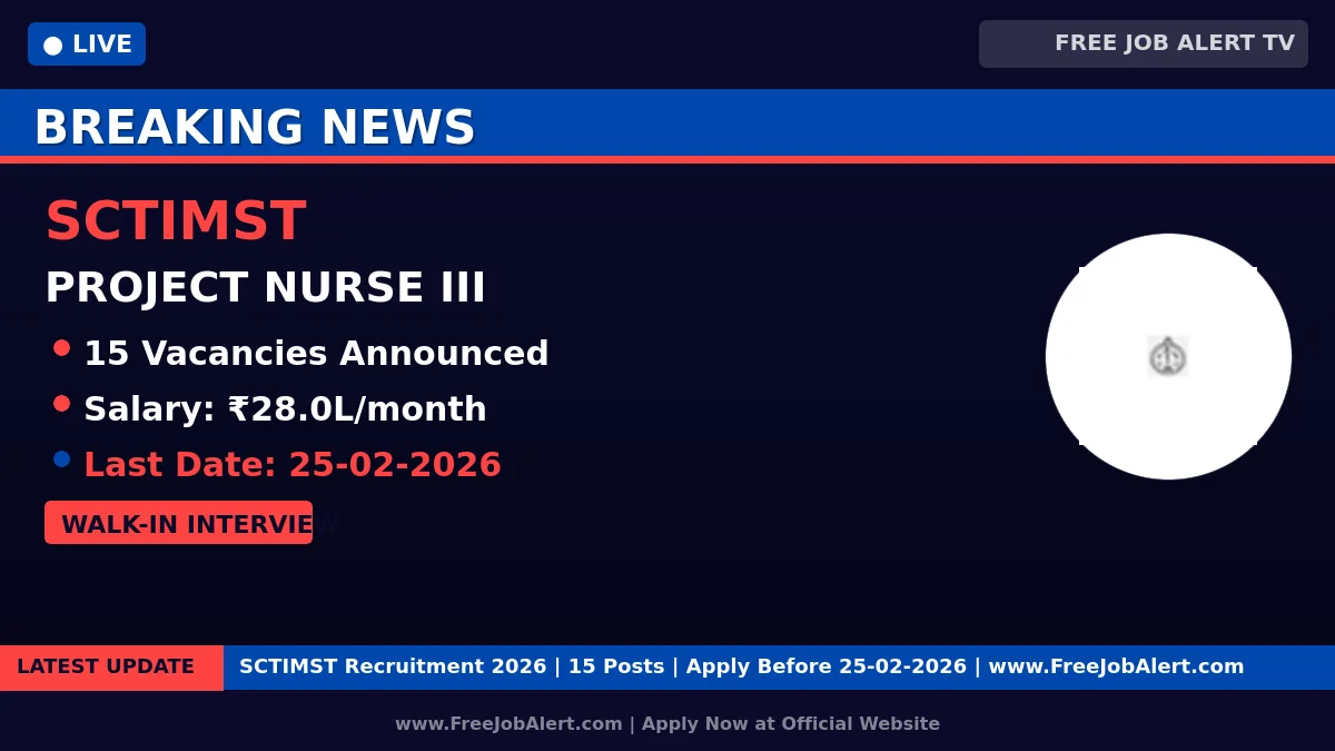 Sree Chitra Tirunal Institute for Medical Sciences and Technology (SCTIMST) has officially announced a Walk-in Interview for the recruitment of 15 PROJECT NURSE III Posts. This walk-in drive offers a great opportunity for candidates looking for healthcare jobs. Candidates with Four year Nursing course from a recognized University with minimum one year clinical experience and valid Kerala Nursing Council registration. Fluency in Malayalam and basic computer knowledge are essential. Experience in Heart Failure Clinics, Cardiology wards and Cardiac ICU is desirable. qualification can directly attend the interview on .