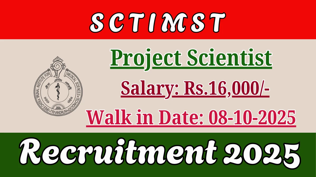 Sree Chitra Tirunal Institute for Medical Sciences and Technology (SCTIMST) Recruitment 2025 for 03 posts of Project Scientist. Candidates with M.Sc Can attend the walkin. The Walk-in on 08-10-2025. For detailed information please visit SCTIMST official website, sctimst.ac.in.