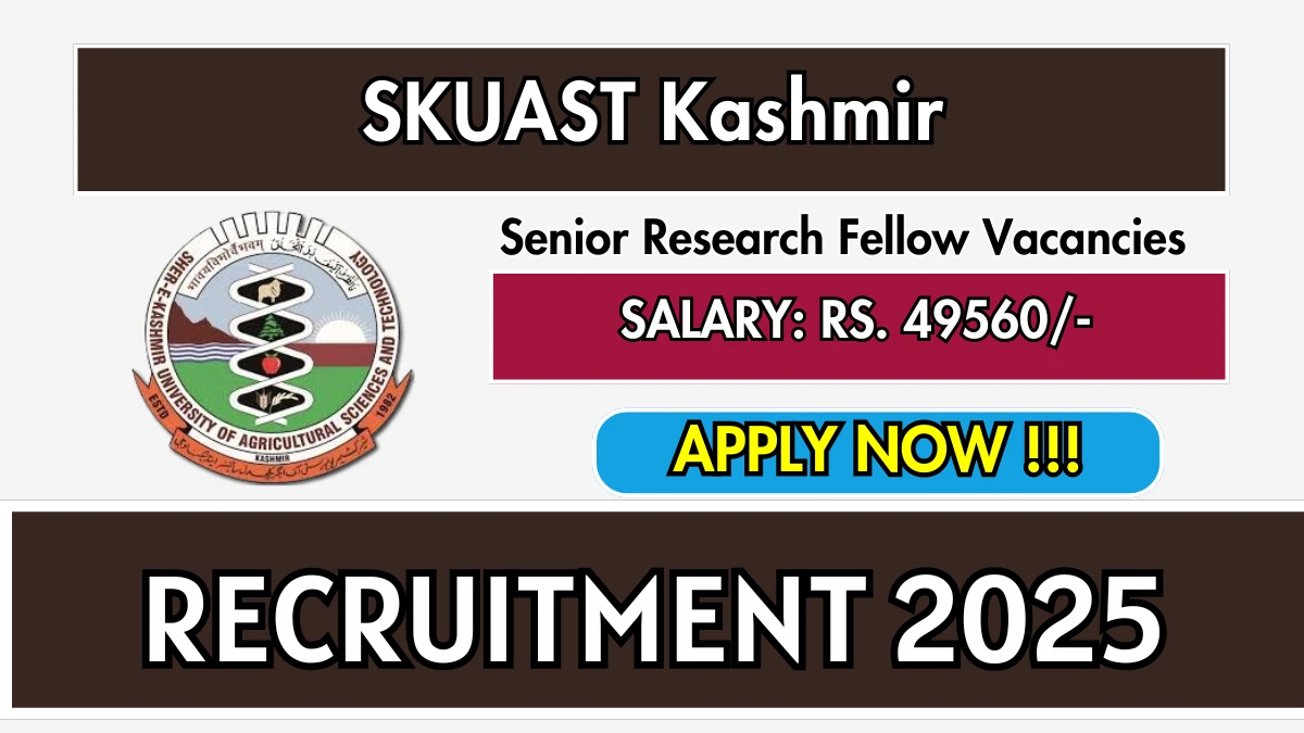 Sher e Kashmir University of Agricultural Sciences and Technology of Kashmir (SKUAST Kashmir) has released an official notification for the recruitment of 01 Senior Research Fellow Posts. Interested and eligible candidates can apply Offline through the official SKUAST Kashmir website. The last date to submit the application form is 17-10-2025. In this article, you’ll find the SKUAST Kashmir Senior Research Fellow Posts recruitment details, including eligibility criteria, age limit, salary structure, selection process, application steps, and direct links to the official notification and Offline application form.