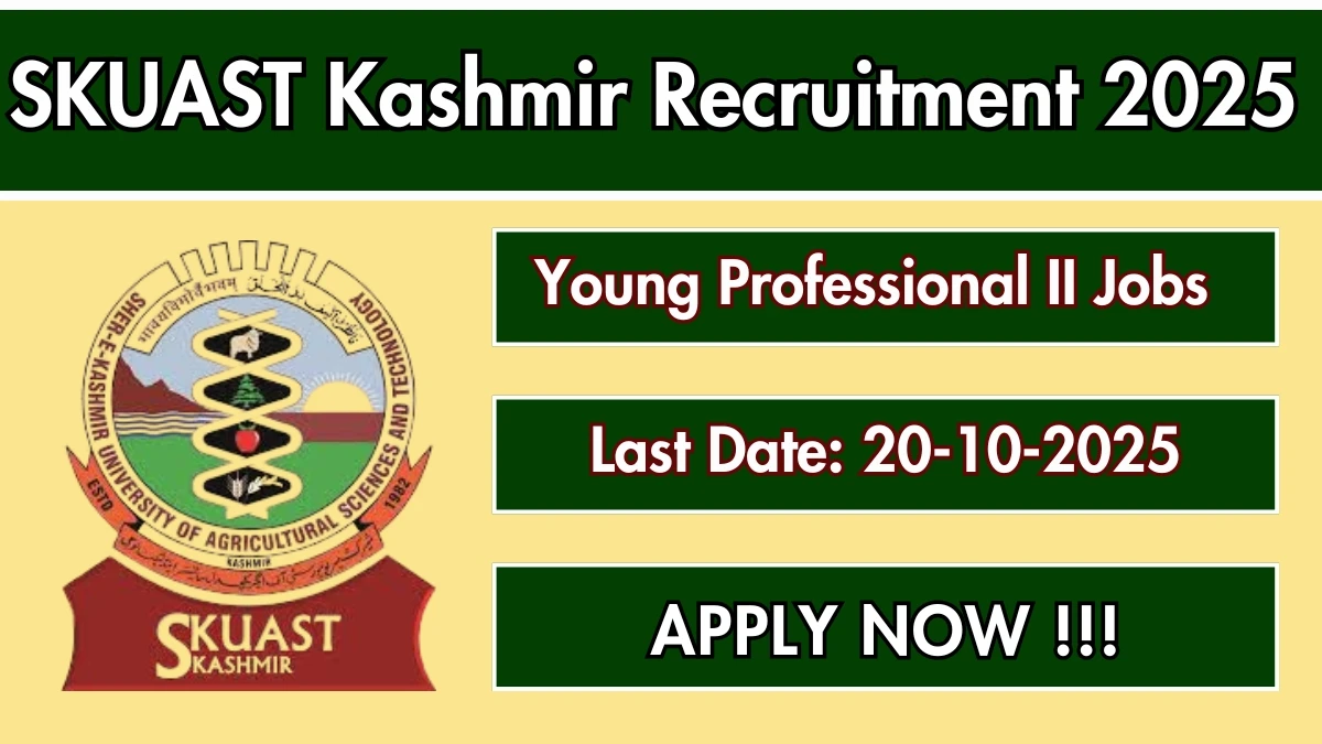 Sher e Kashmir University of Agricultural Sciences and Technology of Kashmir (SKUAST Kashmir) has released an official notification for the recruitment of Young Professional II Posts. Interested and eligible candidates can apply Offline through the official SKUAST Kashmir website. The last date to submit the application form is 20-10-2025. In this article, you’ll find the SKUAST Kashmir Young Professional II Posts recruitment details, including eligibility criteria, age limit, salary structure, selection process, application steps, and direct links to the official notification and Offline application form.