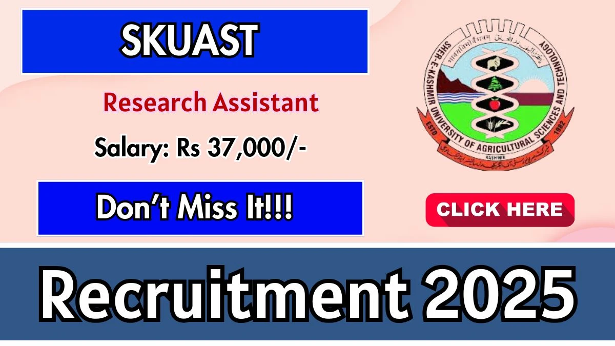 SK University of Agricultural Sciences and Technology of Kashmir (SKUAST) Recruitment 2025 for 01 posts of Research Assistant. Candidates with M.Sc, M.Phil/Ph.D Can attend the walkin. The Walk-in interview on 13-10-2025. For detailed information please visit SKUAST official website, skuastkashmir.ac.in.