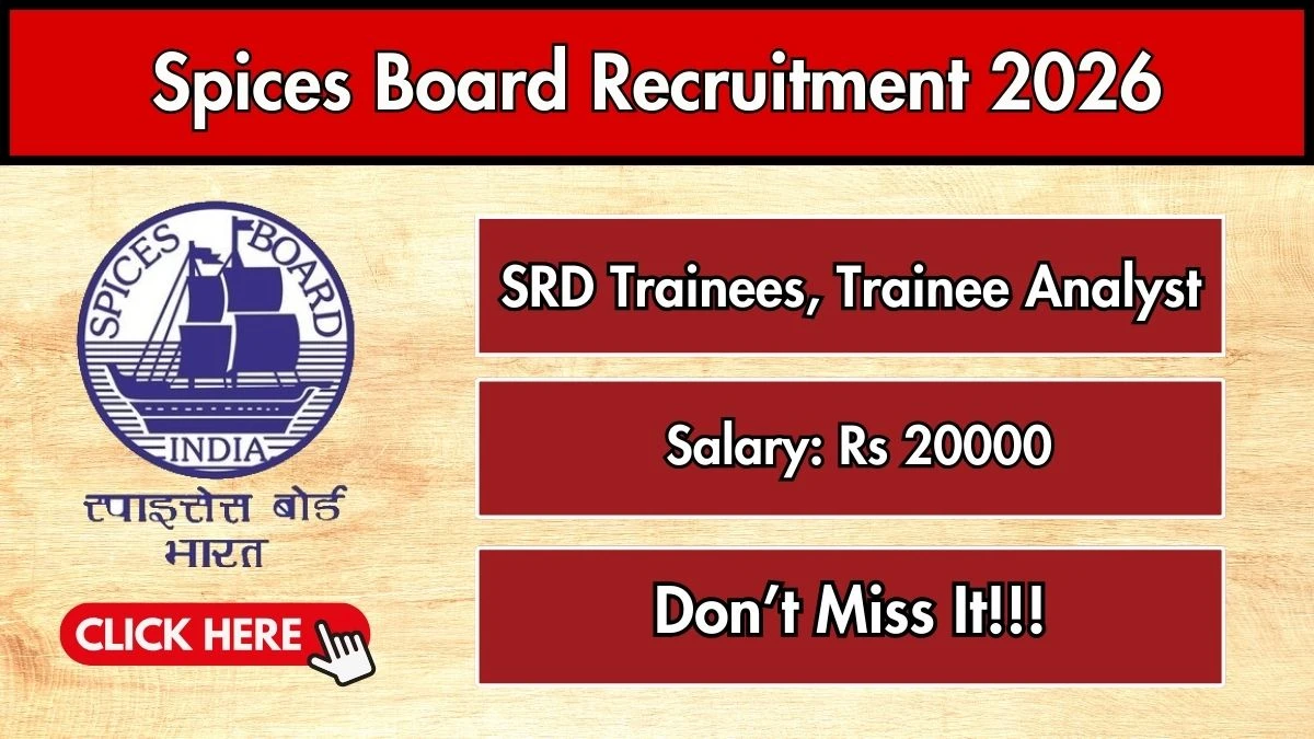 Spices Board Recruitment 2025 for 03 posts of SRD Trainees, Trainee Analyst. Candidates with Bachelors Degree, B.Sc Can attend the walkin. The Walk-in interview on 04-02-2026. For detailed information please visit Spices Board official website, indianspices.com.