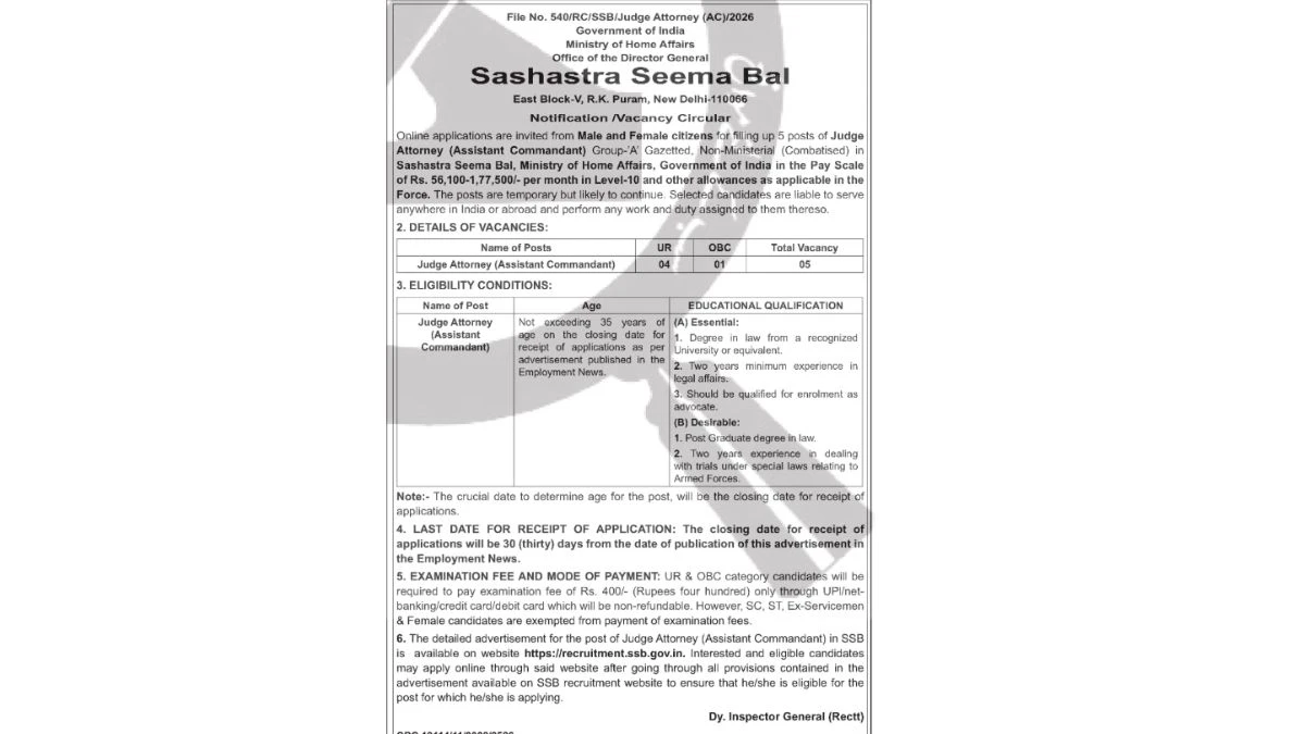Candidates who meet the eligibility criteria can apply online for the SSB Judge Attorney Recruitment 2026.