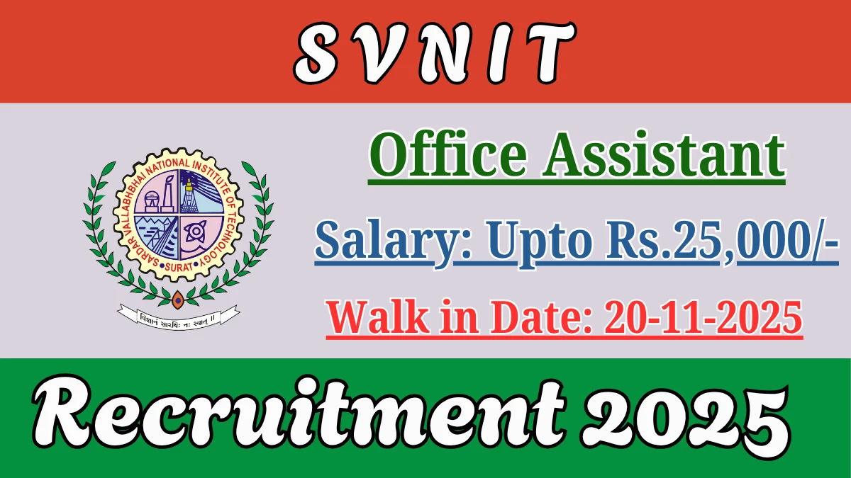 Sardar Vallabhbhai National Institute of Technology (SVNIT) Recruitment 2025 for 01 posts of Office Assistant. Candidates with Any Graduate, Diploma Can attend the walkin. The Walk-in on 20-11-2025. For detailed information please visit SVNIT official website, svnit.ac.in.