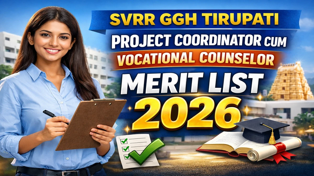 The SVRR GGH Tirupati Final Merit List 2026 contains details of selected candidates for Project Coordinator Cum Vocational Counselor and other posts (Data Entry Operator, Chowkidar, Ward Boy, etc.) on contract/outsourcing basis.