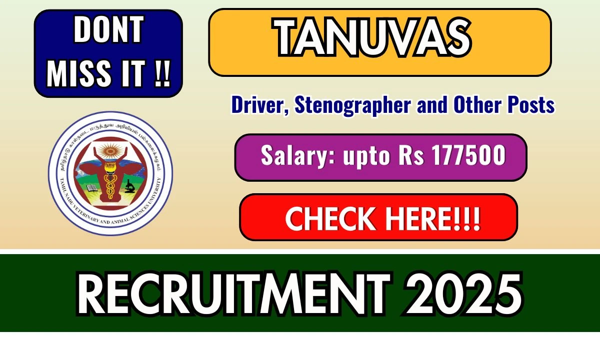 The Tamil Nadu Veterinary and Animal Sciences University (TANUVAS) Recruitment 2025 for 60 posts of Driver, Stenographer and Other. Candidates with Any Bachelors Degree, 12TH, 10TH, Any Masters Degree Can Apply Offline. The Offline application closes on 12-01-2026. The candidate shall apply Offline through TANUVAS website, tanuvas.ac.in.