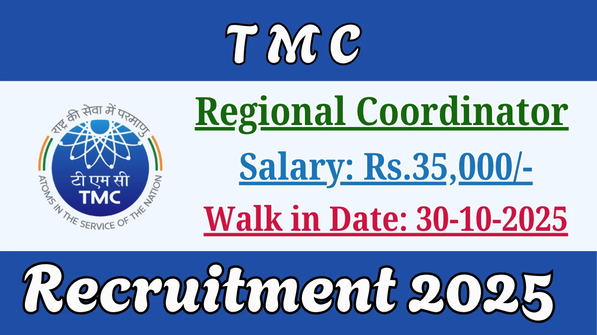 Tata Memorial Centre (TMC) Recruitment 2025 for 01 posts of Regional Coordinator. Candidates with BDS, MBBS, BAMS, BHMS Can attend the walkin. The Walk-in on 30-10-2025. For detailed information please visit TMC official website, tmc.gov.in.