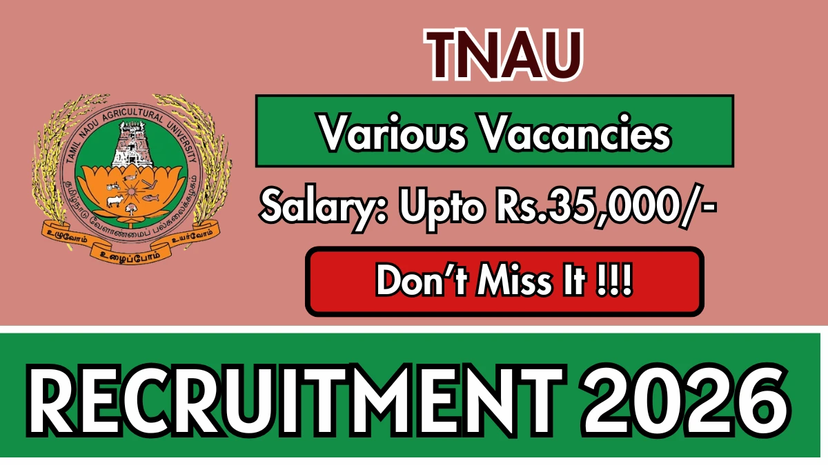 Tamil Nadu Agricultural University (TNAU) Recruitment 2026 for 5 posts of Temporary. Candidates with Diploma, Degree, M.Sc., B.Tech, Ph.D Can atten Walk in . The Walk in Date is 09-03-2026, 11-03-2026, 13-03-026.