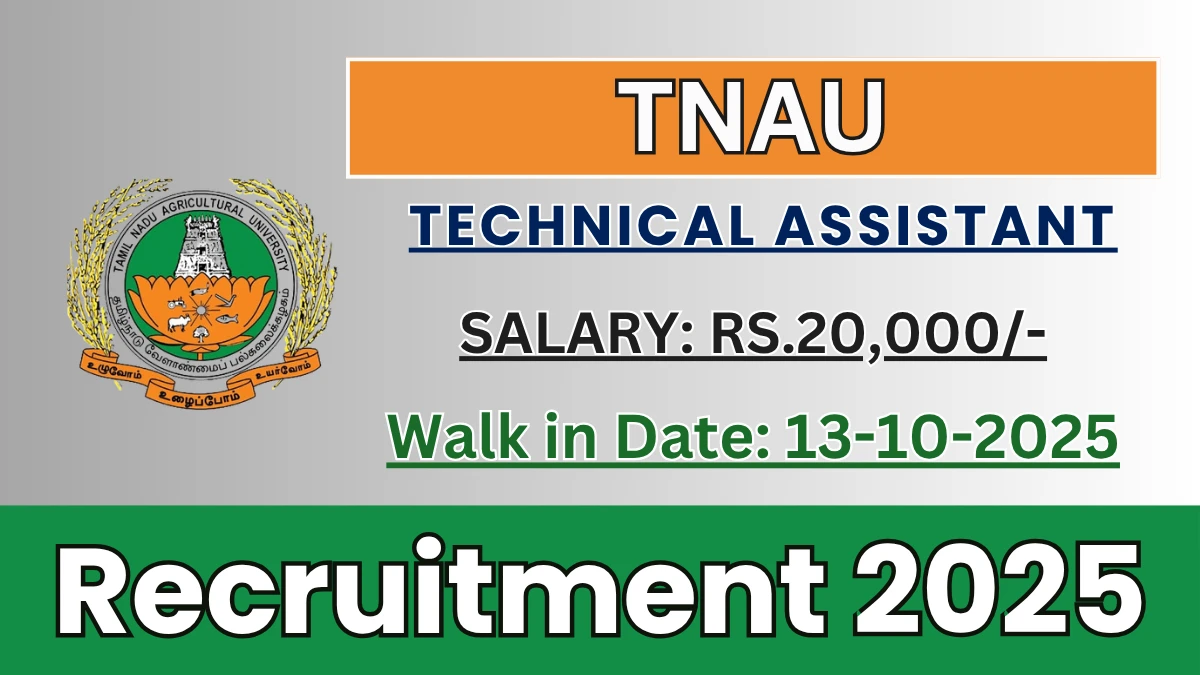 Tamil Nadu Agricultural University (TNAU) Recruitment 2025 for 01 posts of Technical Assistant. Candidates with Any Bachelors Degree, Diploma Can attend the walkin. The Walk-in on 13-10-2025. For detailed information please visit TNAU official website, tnau.ac.in.