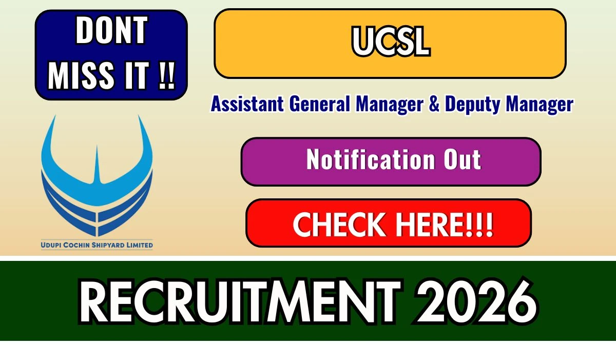 Udupi Cochin Shipyard Limited (UCSL) Assistant General Manager & Deputy Manager Notification 2026 has been released on 20 April 2026 on the official website udupicsl.com. A total of 7 vacancies have been announced through the UCSL AGM & Deputy Manager Recruitment 2026.