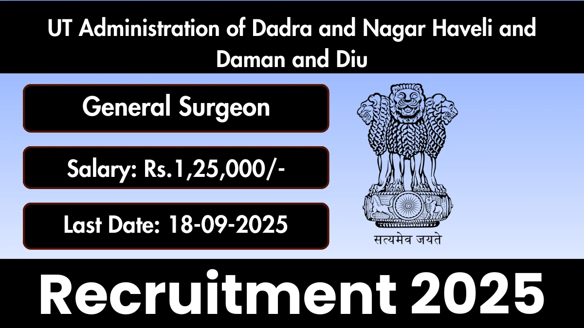 The UT Administration of Dadra and Nagar Haveli and Daman and Diu Recruitment 2025 for 01 posts of General Surgeon. Candidates with MBBS, Diploma, Any Post Graduate, MS/MD Can Apply Offline. The Offline application opens on 04-09-2025, and closes on 18-09-2025. The candidate shall apply Offline through UT Administration of Dadra and Nagar Haveli and Daman and Diu website, ddd.gov.in.