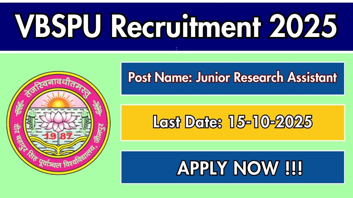 Veer Bahadur Singh Purvanchal University (VBSPU) has released an official notification for the recruitment of 01 Junior Research Assistant Posts. Interested and eligible candidates can apply Offline through the official VBSPU website. The last date to submit the application form is 15-10-2025. In this article, you’ll find the VBSPU Junior Research Assistant Posts recruitment details, including eligibility criteria, age limit, salary structure, selection process, application steps, and direct links to the official notification and Offline application form.