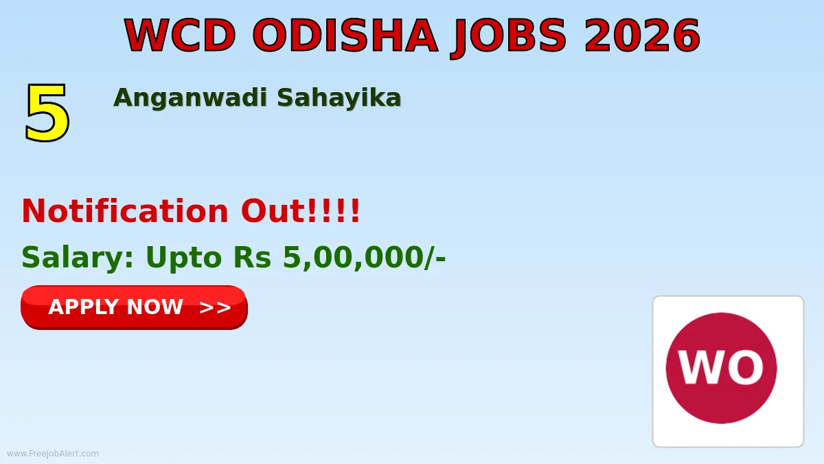 Women and Child Development Department Odisha (WCD Odisha) Recruitment 2024: Women and Child Development Department Odisha has released the official notification for 5 Anganwadi Sahayika posts, inviting applications from eligible candidates in Odisha. This recruitment provides an excellent opportunity for candidates seeking stable and well-paid government jobs.