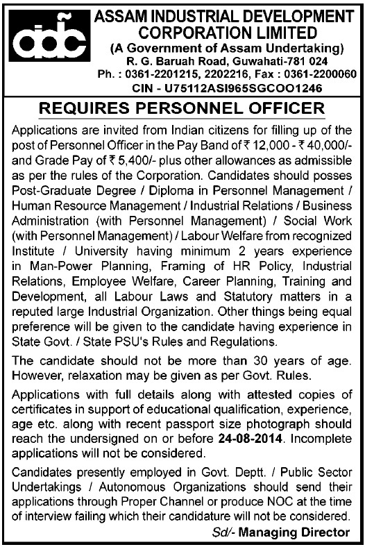 Assam Industrial Development Corporation Recruitment 2014 - Personnel Officer Posts: Assam Industrial Development Corporation Limited has posted a notification for the recruitment of Personnel Officer vacancies. Eligible candidates may send their applications on or before 24-08-2014. Other details like age limit, educational qualification, selection process, how to apply are given below...