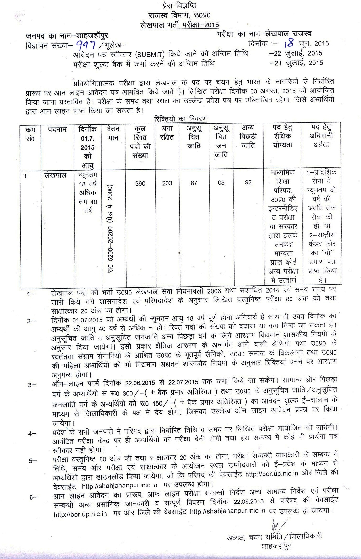 Click here to Recruitment Advt for Shahjahanpur
